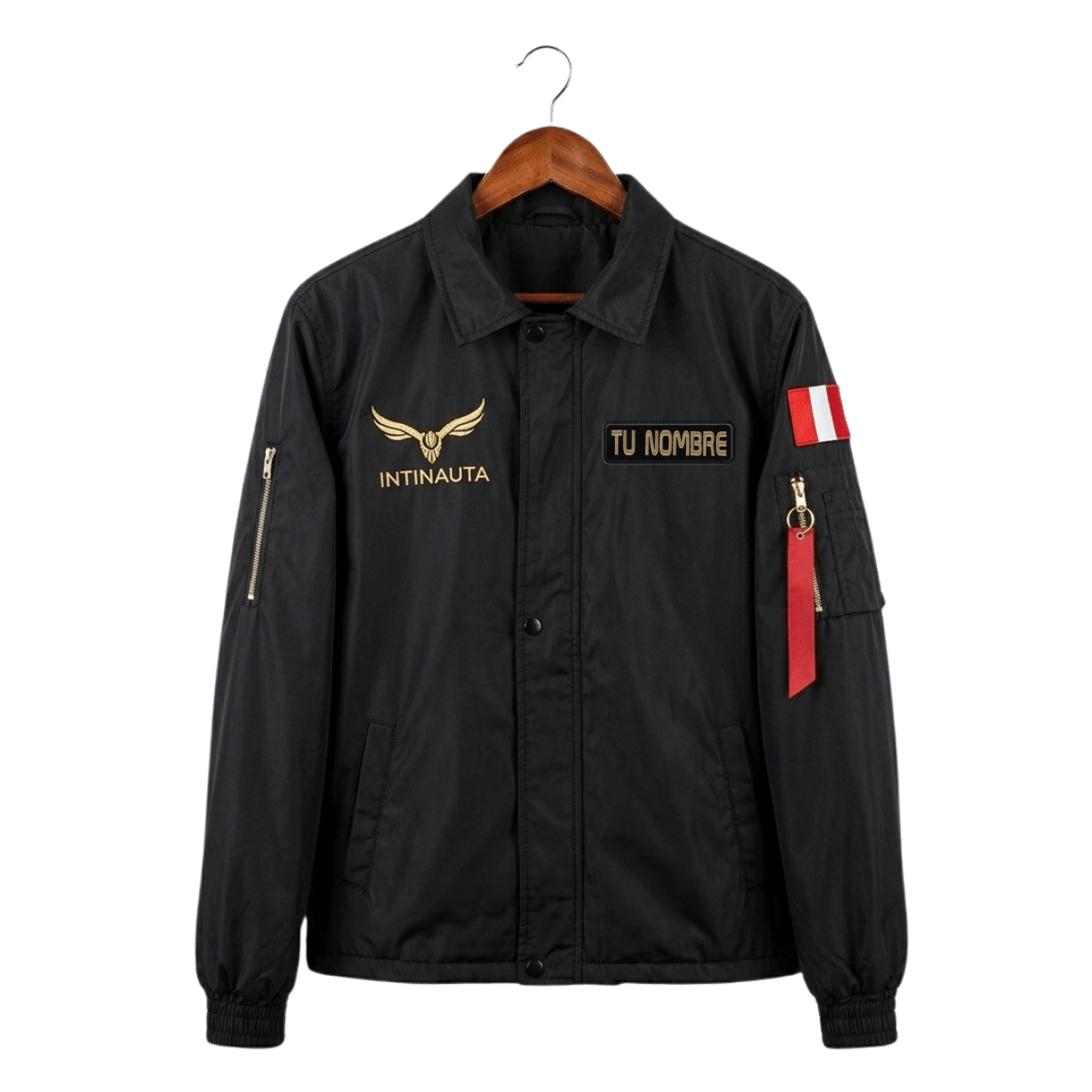 A premium black coach jacket featuring the Intinauta emblem and a custom embroidered name patch for a more personal, mission-inspired look.