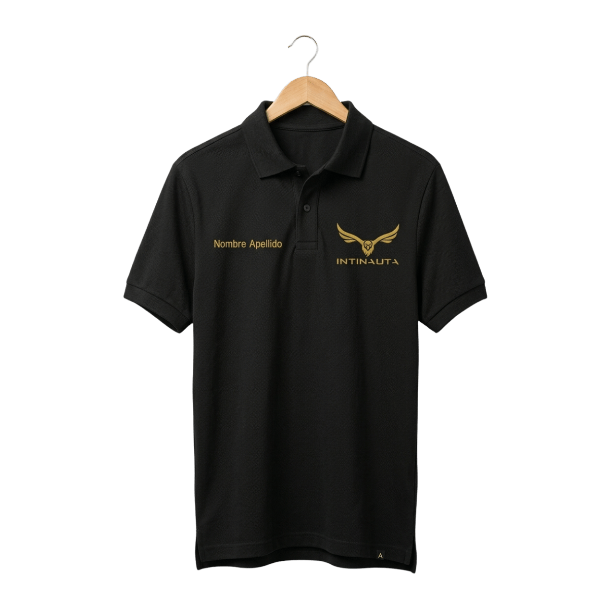 A smart black polo shirt with Intinauta branding and optional name personalization.