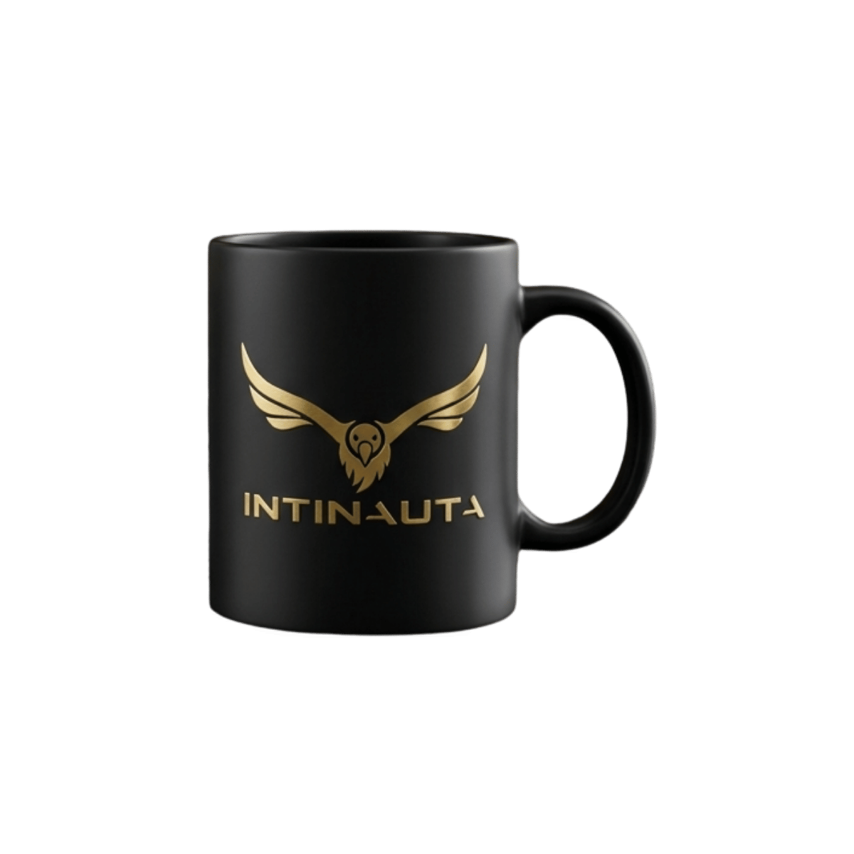 A black signature mug featuring the Intinauta logo in gold.